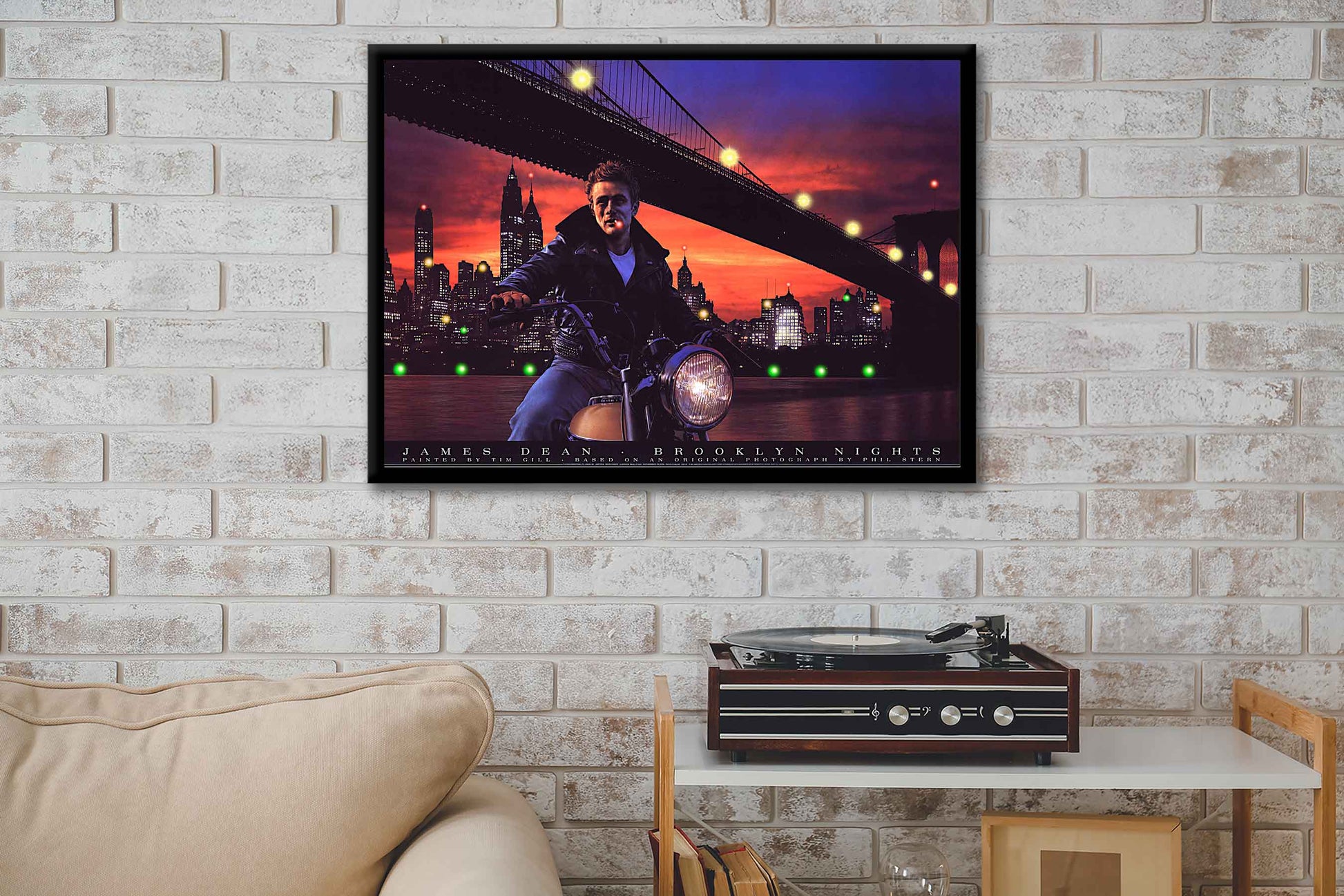 The rough and tumble 50's idol cruises the streets of Brooklyn, New York with Manhattan skyline in background. Framed picture with LED lights from Electric Art. Yellow L.E.D. lights across bridge. Red, Yellow & Green L.E.Ds accent Manhattan Skyscrapers.