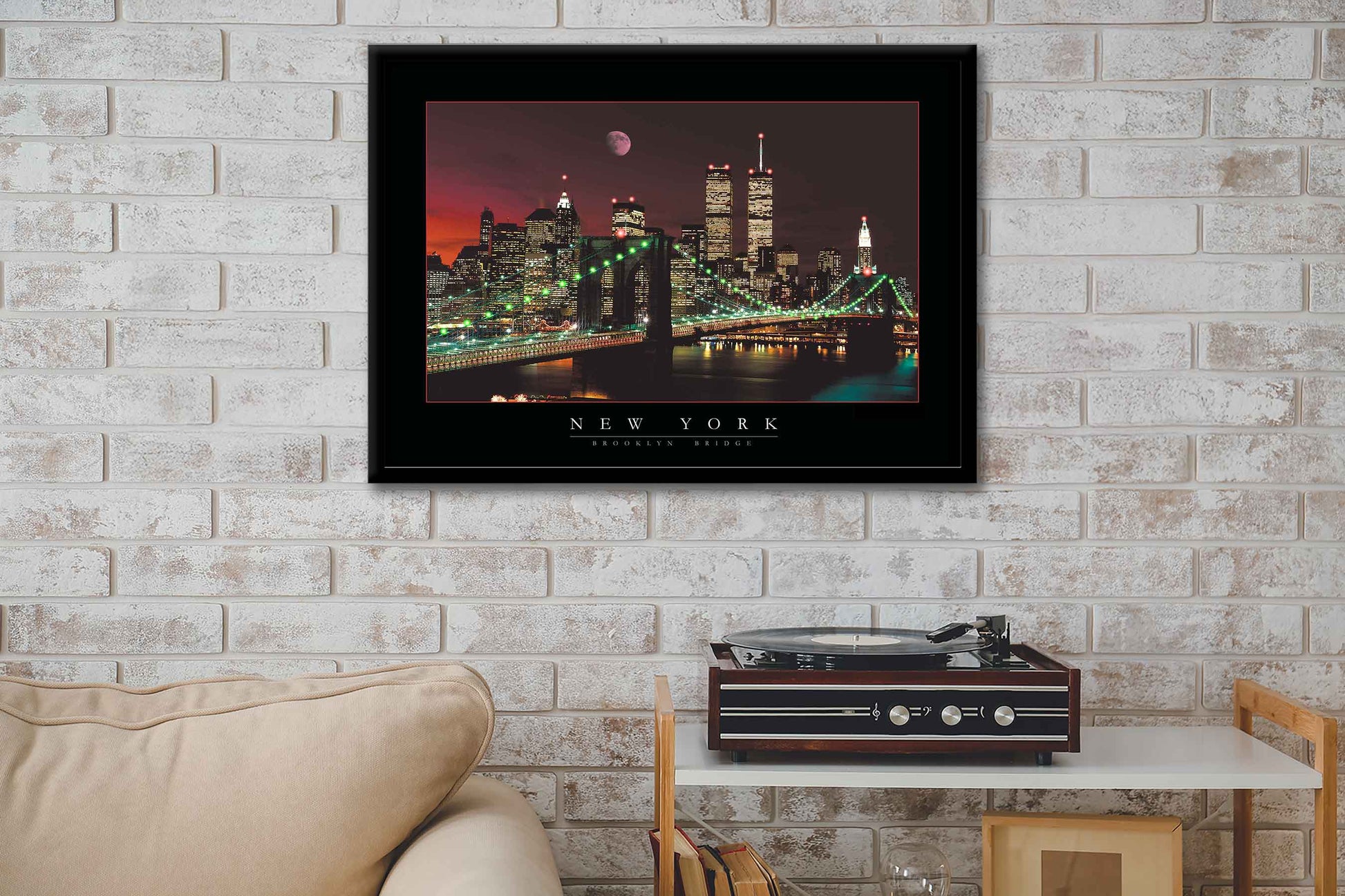 Dramatic night time view of the former New York City skyline with the World Trade Center twin towers and Brooklyn Bridge in foreground. Framed art picture with LED lighting effects by Electric Art. Red L.E.D. lights on buildings and bridge pylons. Green L.E.D. lights across bridge.