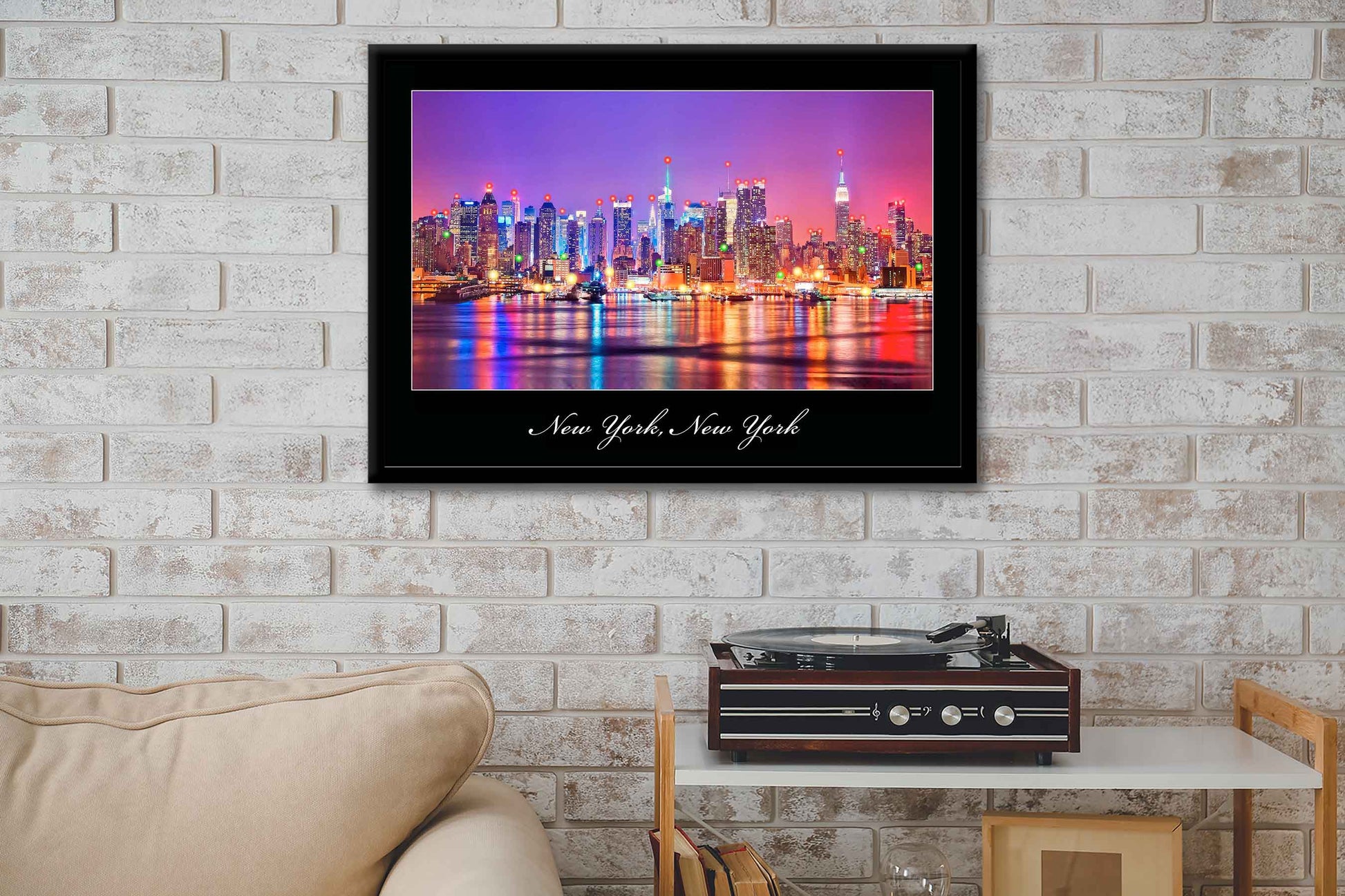 Breathtaking panoramic view of the iconic New York City skyline at twilight Beautifully framed picture with LED lighting effects from Electric Art. Red and Yellow L.E.D. lights accent street and building lights.