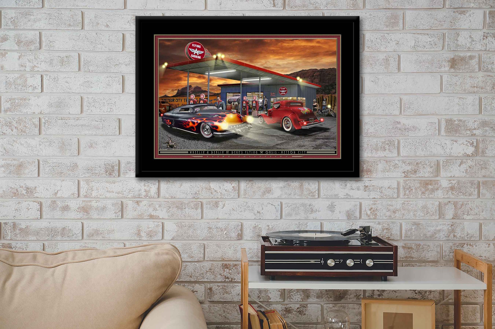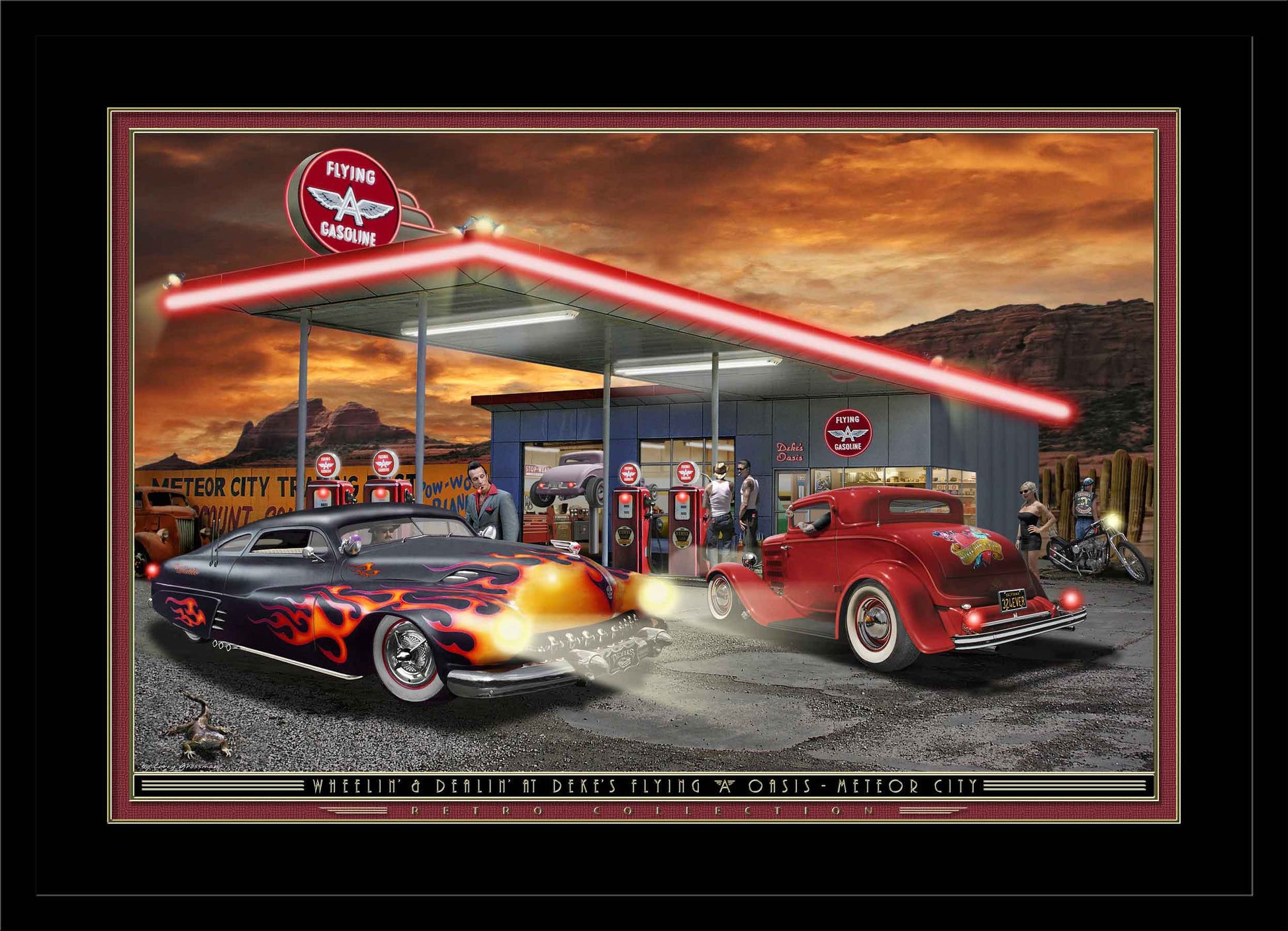 A radically chopped '49 Merc and '32 full fendered Ford Coupe pull into fill up at the "Flying A" gas station in Meteor City, AZ. Framed artwork with Neon lighting effects added by Electric Art. Mini Light Bulbs in car headlights. Red & Yellow L.E.D.s light up tail lights and building.